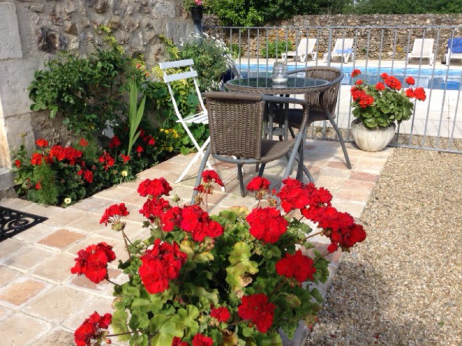 Newly built patio area outside the downstairs bedroom has proved a real favourite.... The pots and tubs, extend along the whole of the front of the house.